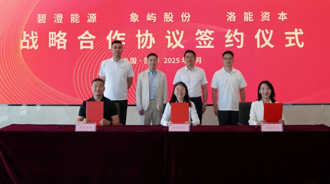 8月12日,碧澄能源与象屿股份、洛能资本签署战略合作协议。象屿集团党委委员、副总裁,象屿股份党委书记、董事长吴捷,碧澄能源董事长、洛能资本首席执行官李文轩,碧澄能源总经理庞博,象屿能源发展董事黄盛宇出席并见证签约。象屿股份副总经理卓薇,碧澄能源副总裁兼首席市场官赵苏,洛能资本首席投资官、副总经理杨郁分别代表三方签署战略合作协议。