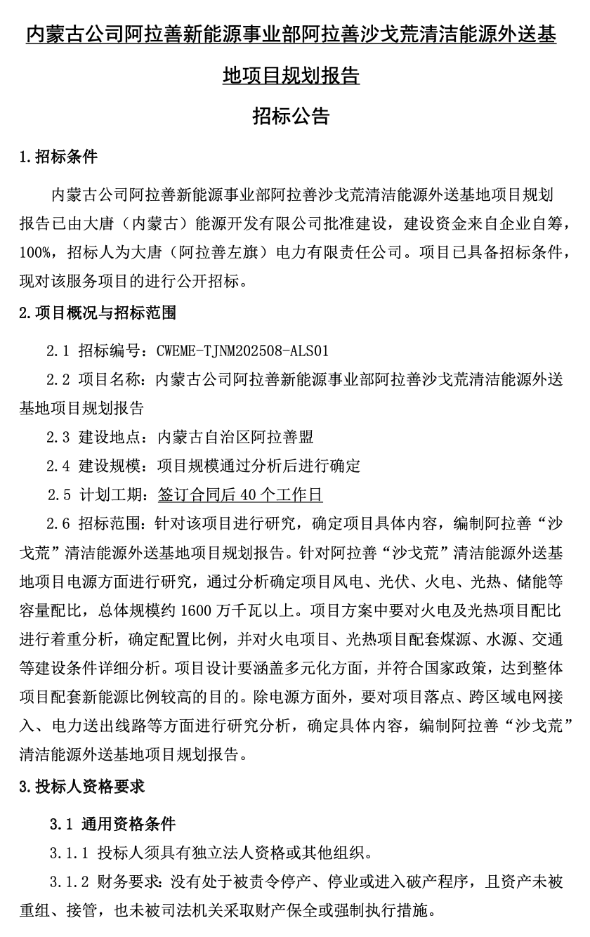 大唐(阿拉善左旗)电力有限责任公司日前对内蒙古公司阿拉善新能源事业部阿拉善沙戈荒清洁能源外送基地项目规划报告进行招标,标志着大唐阿拉善16GW沙戈荒外送基地项目规划启动。该项目总体规模约1600万千瓦以上,招标范围为针对该项目进行研究,确定项目具体内容,编制阿拉善“沙戈荒”清洁能源外送基地项目规划报告。项目需确定风电、光伏、火电、光热、储能等容量配比,对火电及光热项目配比着重分析,还需对项目落点、跨区域电网接入、电力送出线路等方面进行研究分析。