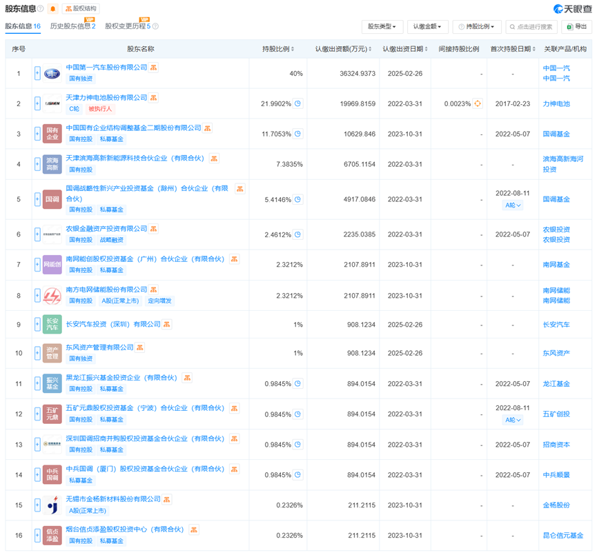 翻开中汽新能的股权关系列表,中国一汽、农银投资、南网储能、长安汽车、东风资产、五矿创投“群贤毕至”。即便不作特殊说明,也不妨碍从这份长长的名单中读出一众央国企豪门的姓名。