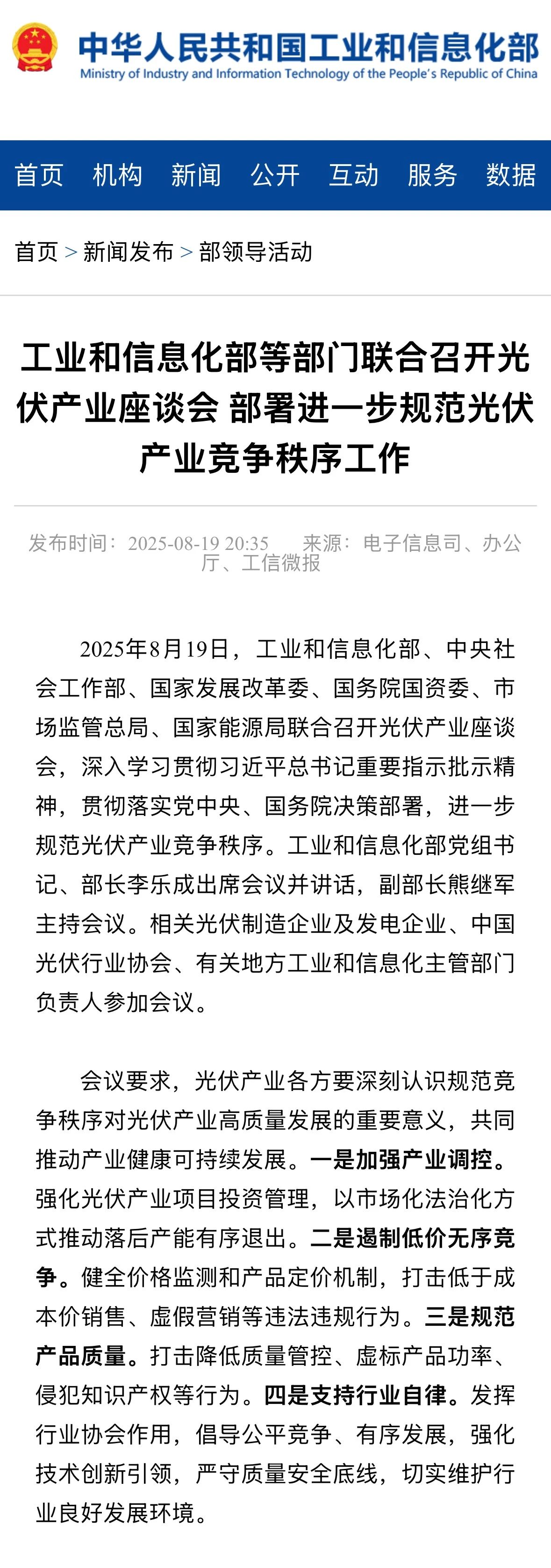 8月19日,工业和信息化部、中央社会工作部、国家发展改革委、国务院国资委、市场监管总局、国家能源局联合召开光伏产业座谈会,深入学习贯彻习近平总书记重要指示批示精神,贯彻落实党中央、国务院决策部署,进一步规范光伏产业竞争秩序。工业和信息化部党组书记、部长李乐成出席会议并讲话,副部长熊继军主持会议。相关光伏制造企业及发电企业、中国光伏行业协会、有关地方工业和信息化主管部门负责人参加会议。全国人大代表、中国光伏行业协会首任理事长和名誉理事长、光伏科学与技术全国重点实验室主任、天合光能董事长高纪凡参加座谈会并作为光伏制造企业唯一代表发言。