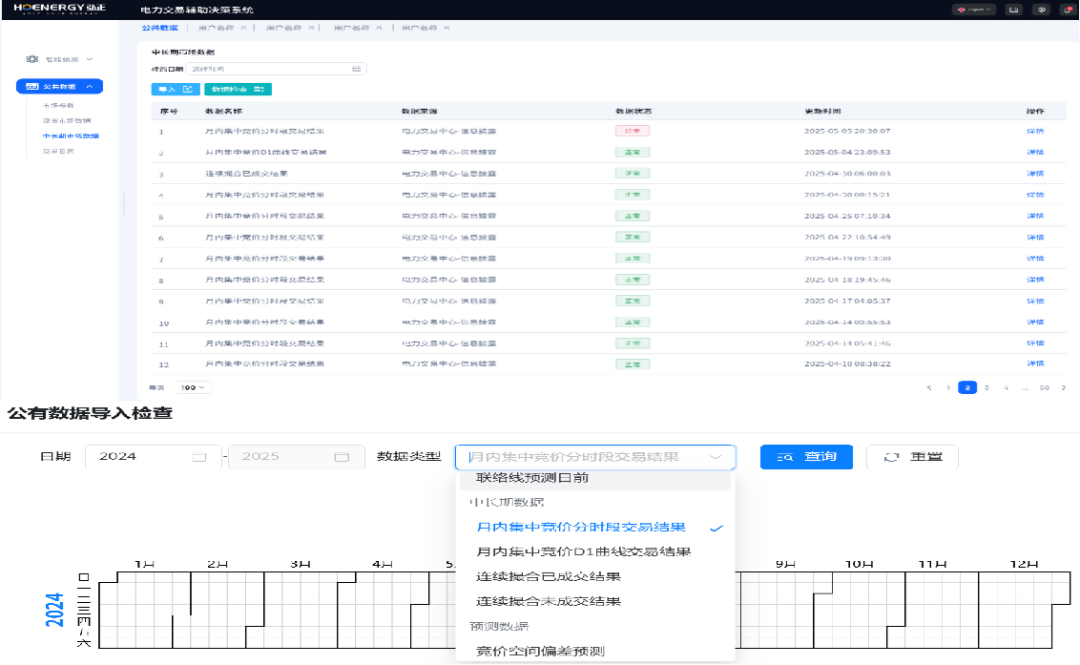 在私有数据层面,系统集成场站基本信息、设备运行参数及历史交易结算数据,直观呈现电站基础运营状态与交易明细,为策略制定提供底层支撑;公有数据模块则聚焦市场动态,通过竞价空间分析(日前/实时出清价格、市场负荷可视化)、相似日分析(基于运行日参数匹配典型历史日辅助电价预测)、多维度数据交叉验证等工具,深度挖掘供需关系与价格波动规律,最终以“气象-发电-价格”三位一体的算法策略体系,为策略制定提供前置指引。