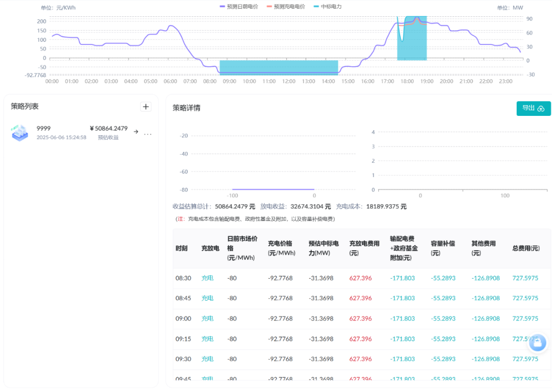 作为系统最核心的模块,交易辅助决策聚焦“策略生成-跟踪-优化”全链路,覆盖中长期与现货市场等多场景。基于价格预测、市场分析及交易规则,系统自动生成日前申报策略,并动态跟踪政策与规则变化持续迭代模型,确保策略适配市场最新环境;同时通过机器学习、深度学习等算法,综合考量供需关系、价格趋势等关键因素,智能输出现货竞价的最优策略,支持多市场协同优化,助力发电侧增收、用电侧降本。