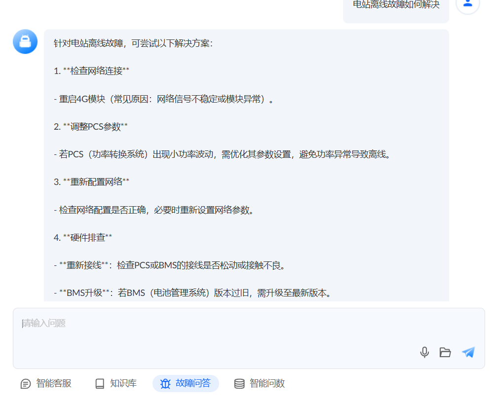 考虑到电力交易涉及大量专业数据与复杂规则,弘正储能开发了基于本地化部署大语言模型的AI智能体,覆盖企业级交互场景的四大核心功能:智能客服提供7×24小时政策咨询、操作指导;知识库问答支持快速检索市场规则、历史案例;故障问答可快速定位系统异常原因并提供解决方案;智能问答则通过自然语言提问直接获取结构化数据,大幅提升信息获取效率。