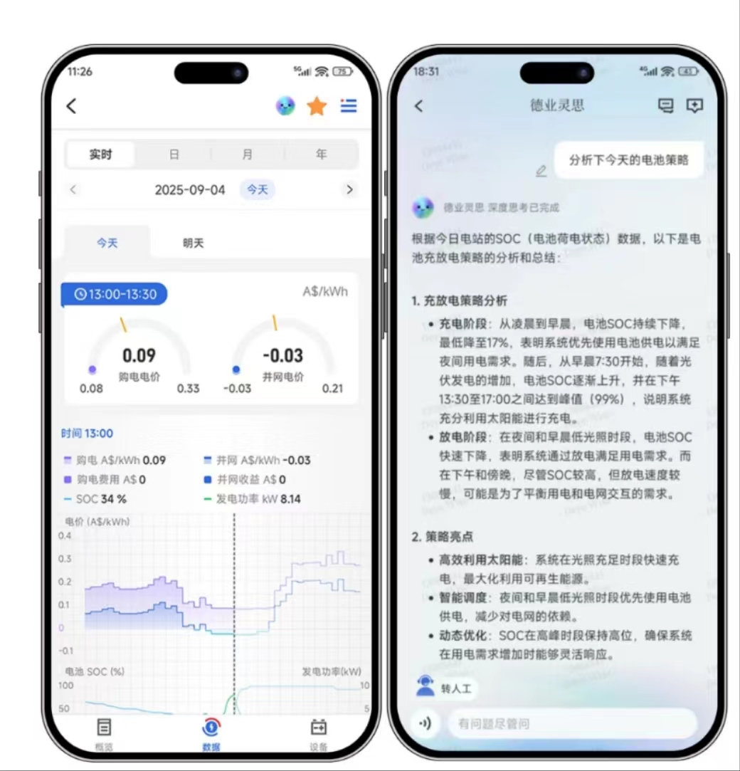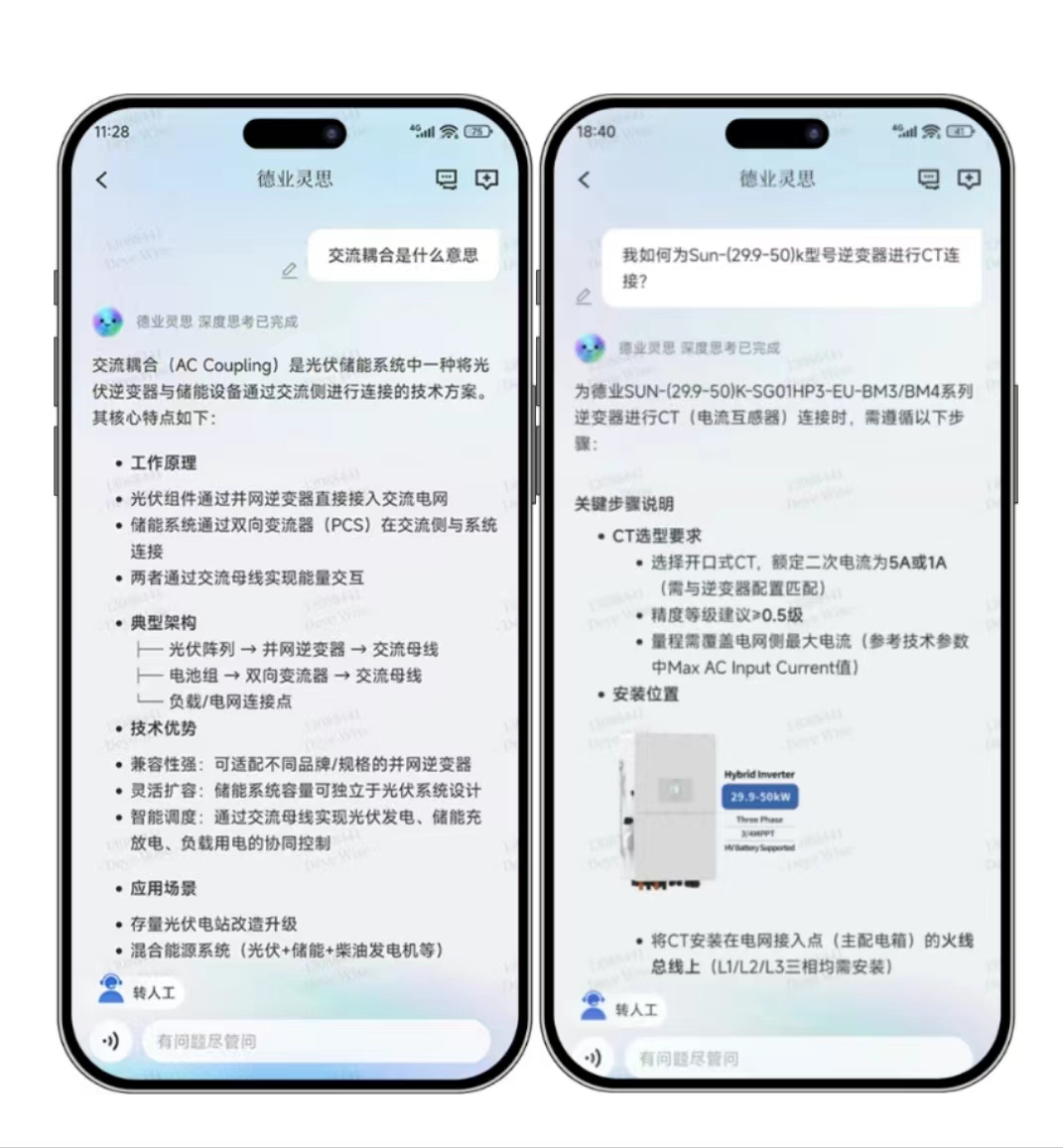 区别于通用型AI助手,“灵思”深度融合能源行业知识、德业产品技术矩阵与实际应用场景,成为真正具备能源属性的AI顾问。它不仅实现即时响应,更提供精准、高效、可信任的能源管理与技术服务,助力全球用户拥有一位全天候在线的“AI能源专家”。