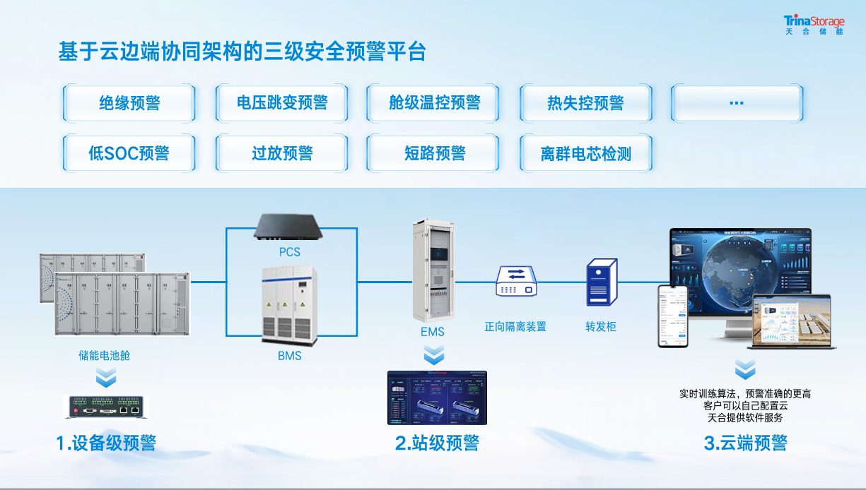 此外,天合储能构建了“云-边-端”协同的三级安全预警平台,覆盖绝缘异常、电压跳变、热失控、离群电芯等关键风险点,实现从设备级、站级到云端的立体化监控。结合AI大数据全景监测平台,可对电芯、PCS、电池舱等核心设备进行健康评估与故障预测,实现24小时动态运维,提前识别隐患并预警,有效杜绝安全风险,契合《专项行动方案》中关于“人工智能+”融合应用的要求。