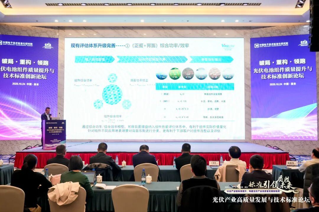 天合光能光伏产品事业部技术工程副总监许贵军受邀出席,并发表《n型光伏产品技术趋势与组件综合性能评价》主题演讲,倡导行业建立和完善组件综合性能评价标准体系,并以TOPCon技术在度电成本(LCOE)优化、双面率和低辐照性能方面的优势为例,展示标准升级对推动光伏产业高质量发展的重要价值。