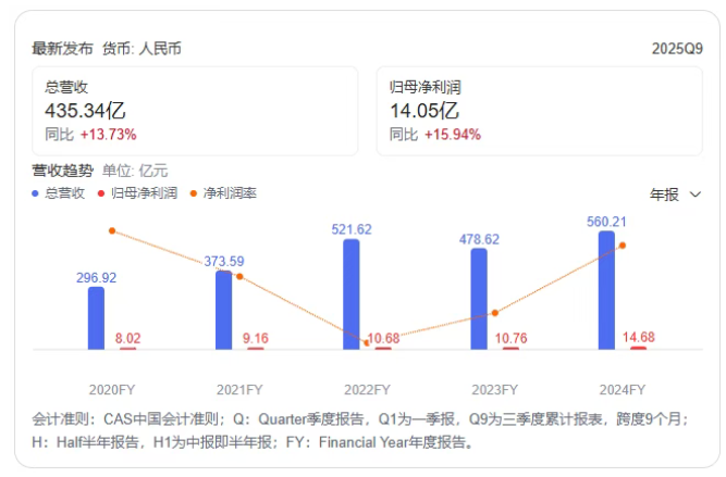 从单季度看,第三季度营收165.49亿元,同比增长15.24%;净利润5.5亿元,同比增长41.51%,保持较高增速。