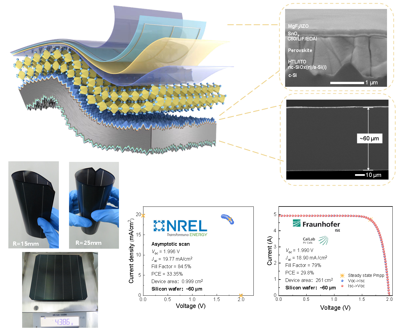 研发成果二:全硅片尺寸的轻质柔性钙钛矿晶硅叠层器件