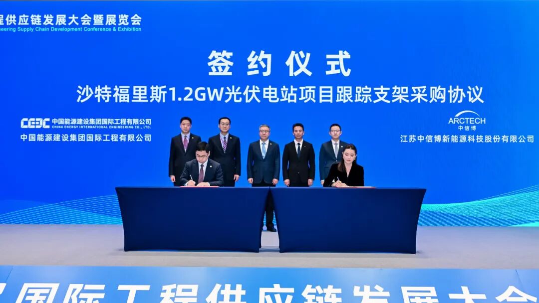 近日,在2025国际工程供应链发展大会上,中信博与中国能源建设集团国际工程有限公司签署沙特PIF6福里斯1.2GW光伏项目跟踪支架合作协议。中国能源建设集团国际工程有限公司副总经理龚谦、中信博中国区总裁郭菲代表双方签署合作协议,中国对外承包商会会长房秋晨,中国能源建设股份有限公司党委委员、海外运营总监吕泽翔,中国能建国际建设集团有限公司副总裁叶晖,中信博董事、高级副总裁周石俊等现场见证签约。