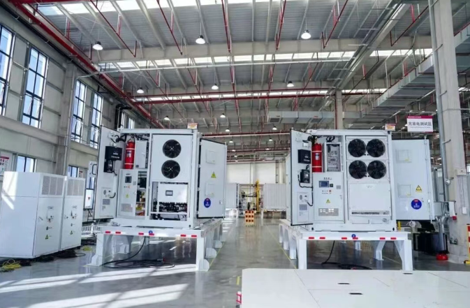 高性能储能产品矩阵:在成品装配区,工商业储能柜与储能舱产线并行设置,通过AGV智能调度平台及厂级MES系统,实现了从舱体上料、系统安装到PACK入舱、簇级检测的闭环管理,可灵活开展261kWh、522kWh等储能柜产品及1044kWh、5MWh、6.25MWh等储能舱产品的并行装配、生产和测试,确保每一台出厂设备都达到国际标准。