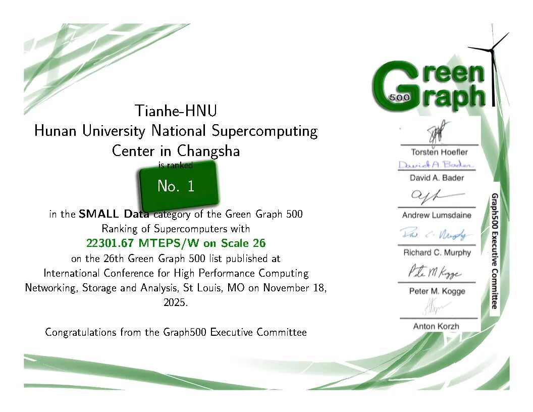 近日,国际权威超级计算机榜单Graph500最新结果正式公布,国家超级计算长沙中心的“天河新一代”国产主机系统以22301.67 MTEPS/W的性能功耗比再次夺得Graph500小数据图计算能效(GreenGraph500 Small Data)世界第一,实现三连冠。