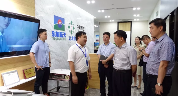 在安轩科技王军总经理的陪同下,刘书记一行首先参观了公司内的光伏智能运维解决方案展厅。王总介绍了相关设备及公司目前技术情况。刘书记对安轩科技在光伏智能运维行业取得的成绩表示赞赏,并对安轩科技推动人工智能、物联网和大数据与光伏产业的深度融合给予了充分肯定。