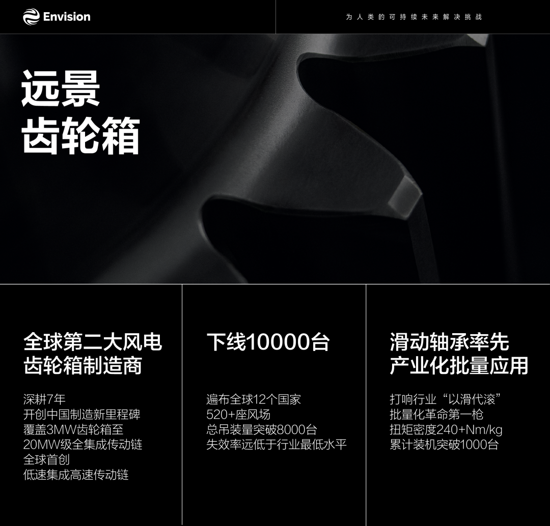 远景能源是全球第二大风电齿轮箱制造商,也是目前唯一拥有齿轮箱工厂的中国风电整机企业,于2018年开启齿轮箱自研,2019年投建工厂实现自制,率先实现全球首创的低速集成高速传动链,覆盖3MW至20MW级全集成传动链全功率段。2025年,远景齿轮箱累计下线超过10000台,开创中国高端制造新里程碑,服务于全球12个国家、520余个风场,总吊装量突破8000台,运行失效率显著低于行业最低标准,长期稳定性、可靠性得到充分验证。
