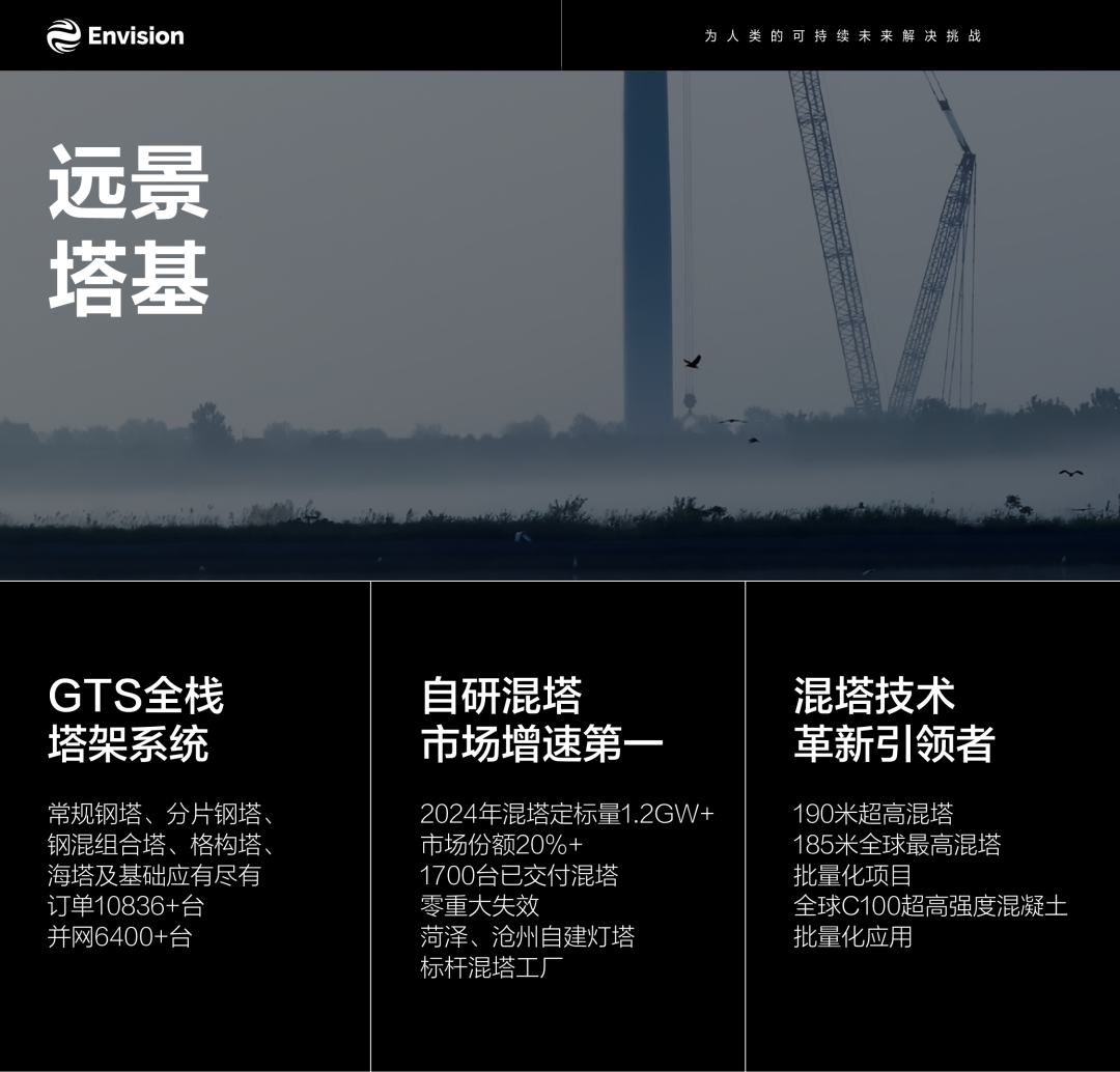 在混塔领域,2024年远景自研混塔定标量已超1.2GW,市场份额突破20%,实现市场增速第一,已交付的1700台混塔保持零重大失效。目前,远景在菏泽、沧州均自建 “灯塔工厂”,为混塔制造树立了行业标杆,形成了高效、智能、可复制的生产模式。作为混塔技术革新的引领者,远景成功打造了全球最高的190米混塔,并实现185米混塔的批量化交付;率先在全球范围内实现C100超高强度混凝土的批量化应用,不仅突破了材料和工艺的极限,也显著提升了塔架的结构性能和寿命。