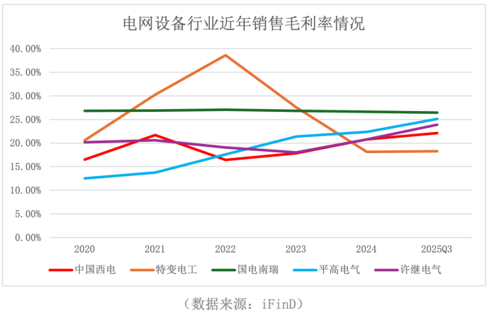 放到电网设备行业内整体来看,中国西电的毛利率表现处于什么水准呢?我们选取电网设备行业内几家代表性公司进行观察,该行业近五年销售毛利率主要在15%-30%之间浮动。