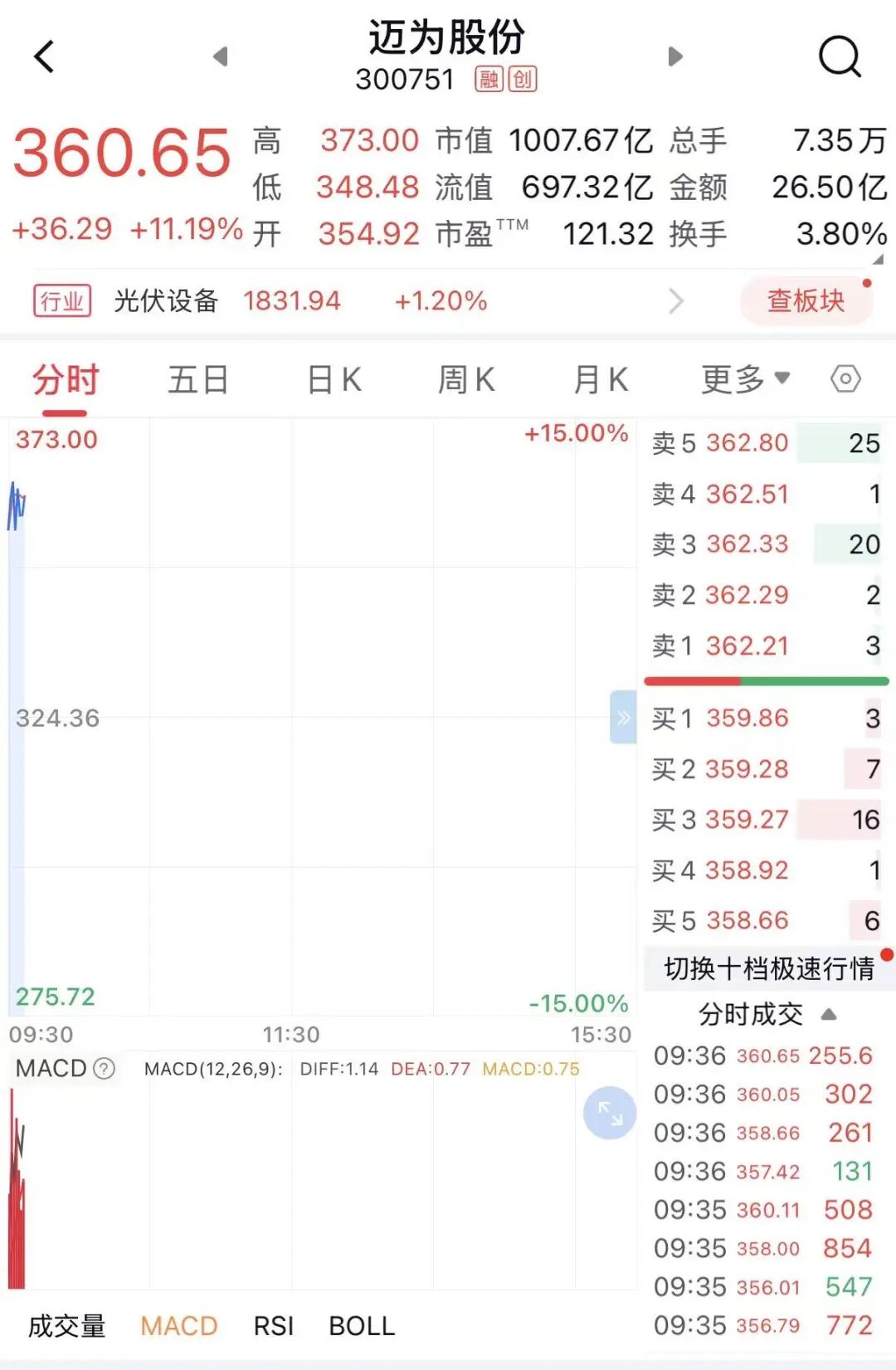 进入2026年,迈为股份市值进入了快速上涨通道,股价从184元飙涨至360元左右,仅20天涨幅近100%。
