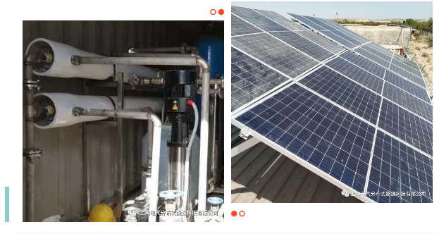 分布式公司建设的光伏电站,采用离网运行的方式,主要设备包含14.4kWh额定容量电池储能、8.28kWp光伏以及3.5kW的淡化装置。通过光伏和储能电池为苦咸水淡化装置供电,使盐水脱盐淡化,达到饮用水指标。