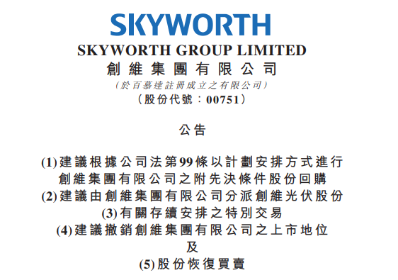 近日,港股上市的创维集团发布公告称,拟通过股份回购的方式退市,同时计划将旗下创维光伏独立上市。