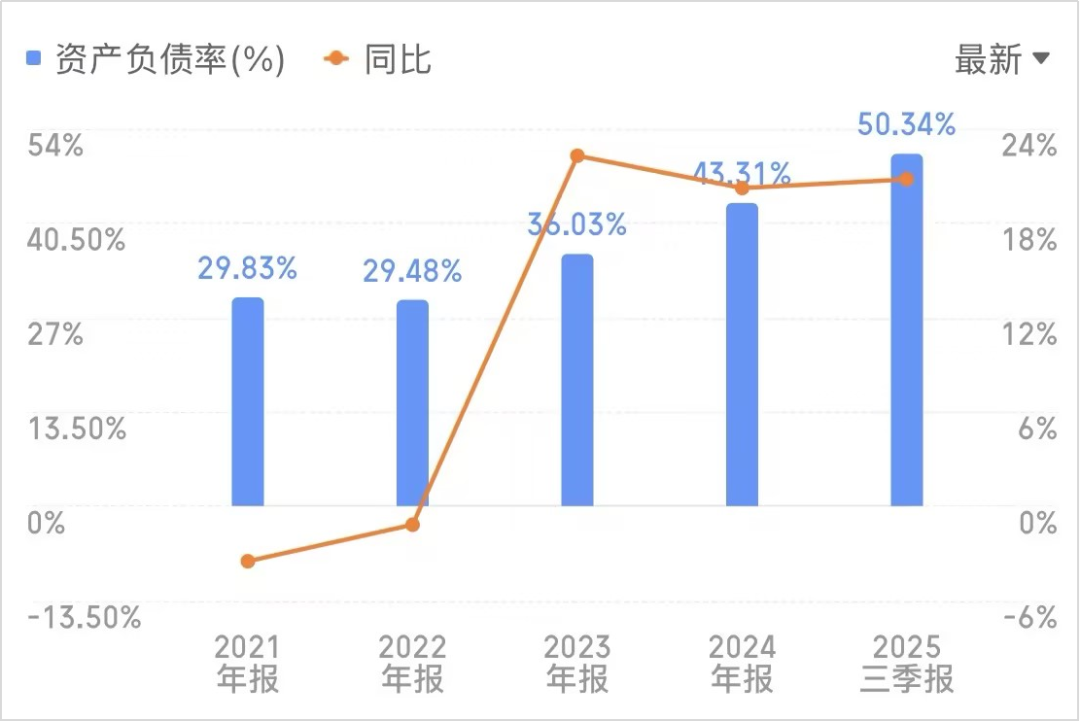 截至2025年三季度末,盛新锂能货币资金仅25.6亿元。而2025年12月、2026年2月,对启成矿业、惠绒矿业的两笔收购就需耗资32.8亿元。与此同时,公司负债率一年内从41.69%攀升至50.34%,是近14年以来的最高值,财务压力显现。