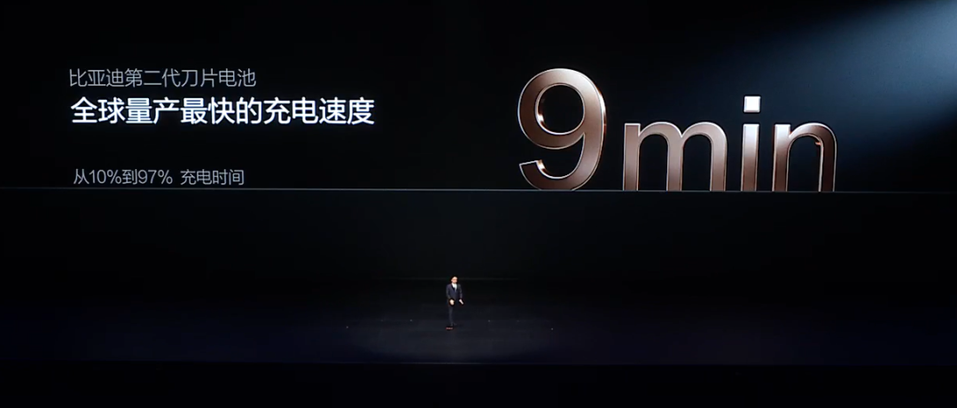 在深圳常温环境下,一辆搭载第二代刀片电池的车型从10%充到70%仅需约5分钟,从10%充到97%大约9分钟。