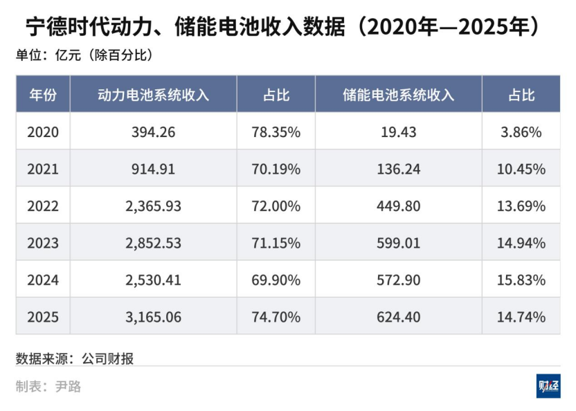 这一增长由动力电池与储能电池业务共同驱动。2025年其动力电池系统收入达3165.06亿元,占比74.7%,储能电池系统收入达624.4亿元,占比14.7%。动力电池的收入占比相较2024年有明显回升,在电池企业普遍出现“动力降,储能增”的趋势时,宁德时代的动力电池业务仍保持较快增长,主要来自高端产品及海外市场需求。