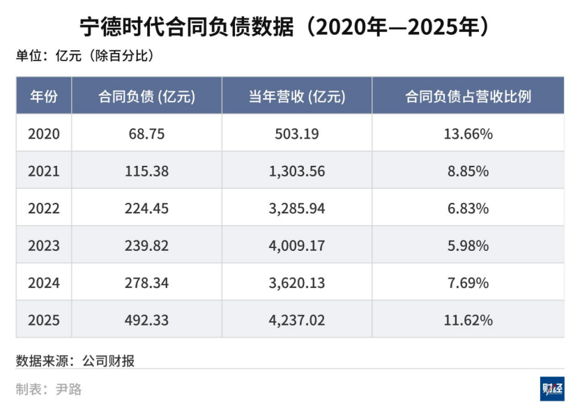 2025年,宁德时代的合同负债金额达到492.33亿元,相较于2024年的278.34亿元,同比增长76.88%。同时,合同负债占当年营业收入的比例,从此前年度的6%—7%左右上升至11.62%。而上一次占比达到两位数是2020年,次年电池市场即出现供不应求。