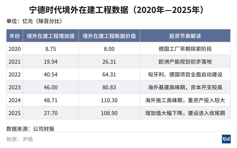 在维持国内市场较高份额的基础上,全球化产能布局是宁德时代后续增长的关键。2025年年报披露的在建工程数据显示,公司海外建设投资规模有所回落,变化主要源于一批海外项目接近建设尾声,逐步由建设阶段转入投产阶段。