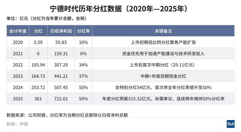 从2020年的5.59亿元稳步提升至2023年的164.73亿元,再到2024年、2025年分别达到253.72亿元和361亿元,宁德时代的分红规模大幅增长。同时,其分红占归母净利润的比例也连续两年稳定在50%,在业务规模扩张后,财务策略正逐渐向稳健经营与注重回报投资者的模式过渡。