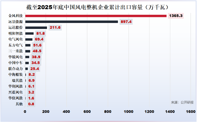 2025年,金风科技出口风机量共629台,容量达386.2万千瓦,累计出口容量1362万千瓦,占比接近48%,相当于中国风电一半出口量都是金风科技完成的。