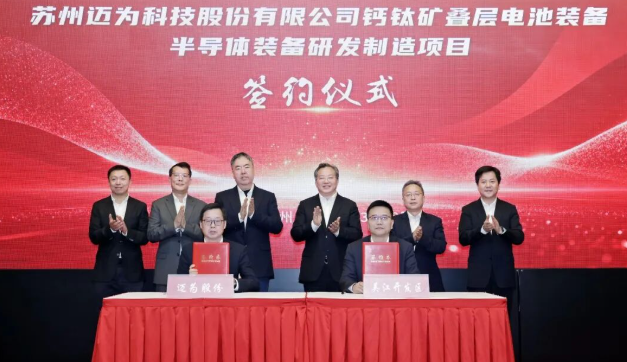 此次签约的两个项目是迈为股份未来10年战略规划布局的关键落子,总投资50亿元,均落户吴江区。其中,钙钛矿叠层电池装备项目计划投资35亿元,将搭建先进研发平台,汇聚行业顶尖人才,持续开展关键技术攻关,进行钙钛矿叠层电池成套装备的规模化生产与产业化应用。半导体装备研发制造项目计划投资15亿元,主要从事半导体生产领域智能化高端装备的研发、制造与销售。