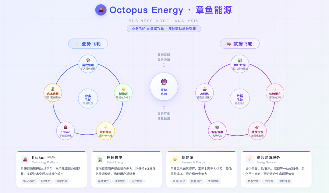 售电(卖电)→ 安装(卖设备/服务)→ Kraken(管理设备)→ 虚拟电厂(卖调峰服务),形成完整价值链。