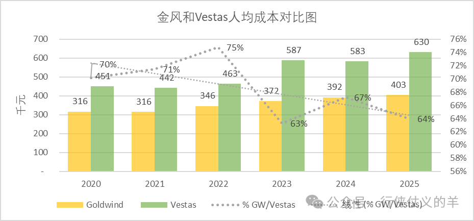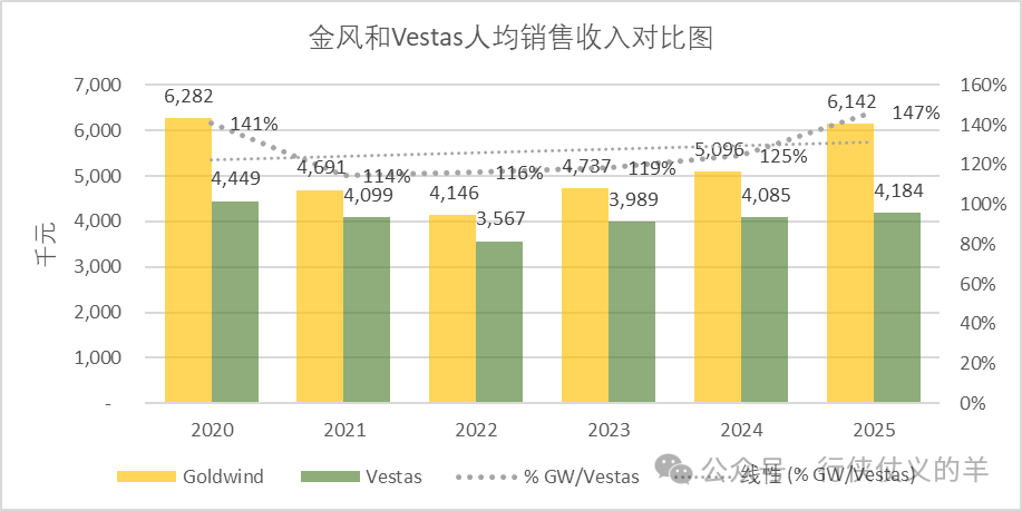 金风科技人均销售收入高于维斯塔斯且在过去五年持续扩大差距,2025年高达47%。