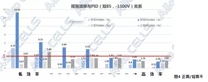 由之前文章及各论坛,业界已经充分了解到爱旭是全球第一家可以做到 双面电池双面测试分档(正面0.1%,背面0.5%分档)的电池片生产商。双面双测分档不但可以降低组件因电池片功率不一致带来的功率损失及电站失配风险,而且可以带来更高的可靠性。图四为不同背面效率电池封组件后正面及背面PID的衰减测试,通过实验结果可以看出,在七块实验组件中,背面含有低效片容易导致PID失效,而背面效率越高则因正面/背面效率更为一致则抗PID性能越好。双面双测分档后将低效电池片分选掉后,单块组件内电池片正面及背面效率均保持一致,从而提升了组件的抗PID性能。