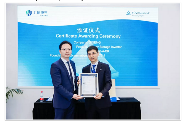 SNEC展会翌日,TÜV莱茵授予上能电气储能逆变器证书,同时,双方就未来进一步合作签署战略合作协议。上能电气李建飞先生,TÜV莱茵李卫春先生参加了相应仪式。