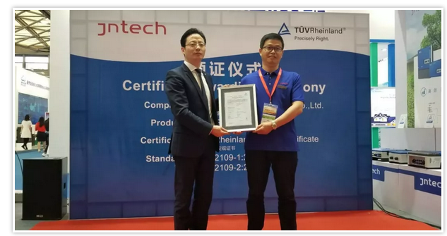 SNEC展会翌日,在合肥金泰克新能源科技展位进行了TÜV莱茵安规证书的颁证仪式。合肥金泰克总经理马志保先生及TÜV莱茵李卫春先生出席了该颁证仪式。
