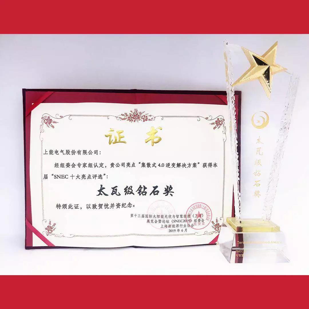 6月6日,经组委会专家组认定,上能电气的《集散式4.0逆变解决方案》荣获“十大亮点”太瓦级钻石奖,在平价时代上能电气卓越的解决方案获得了专家媒体的认可,彰显了上能电气在光伏逆变器领域行业领先的地位。
