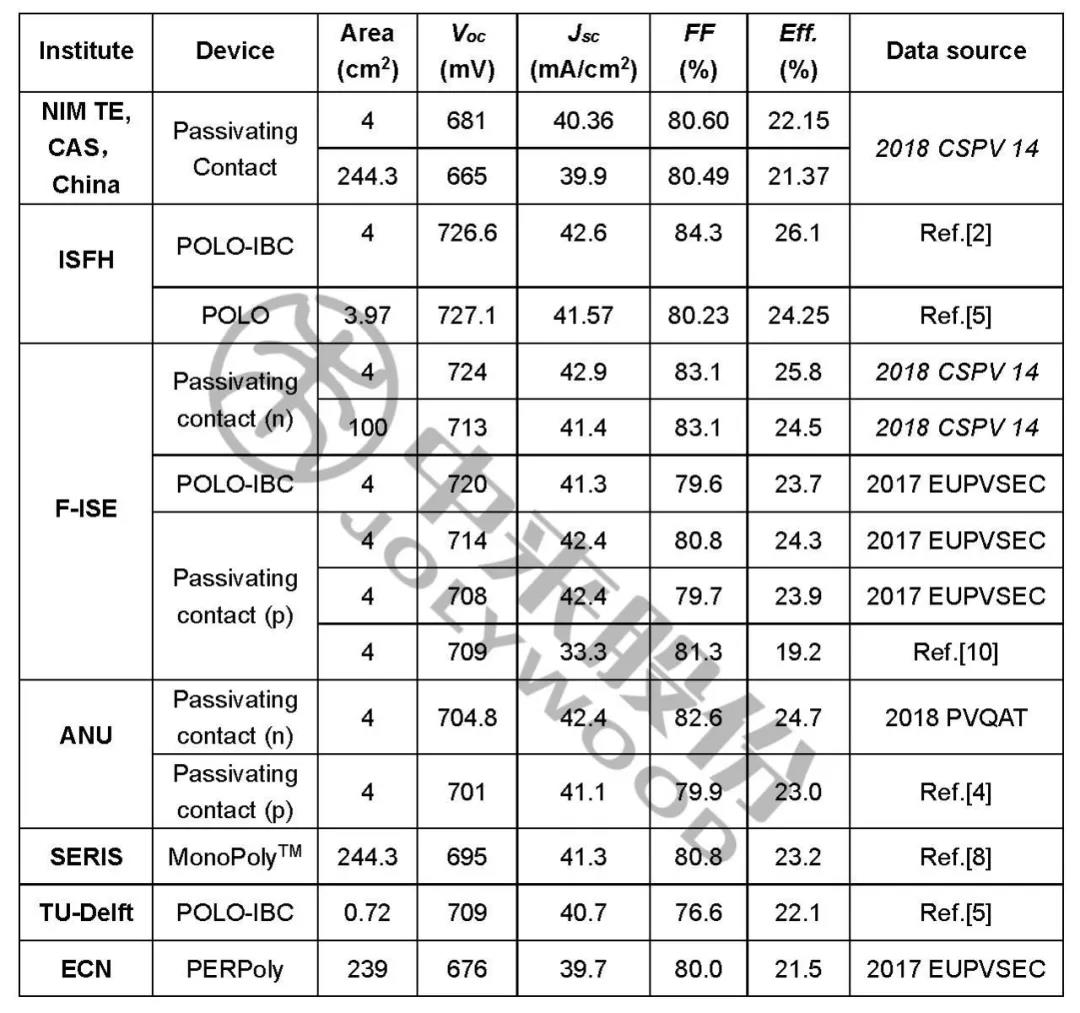 表1. 不同研究所的钝化接触太阳能电池性能参数