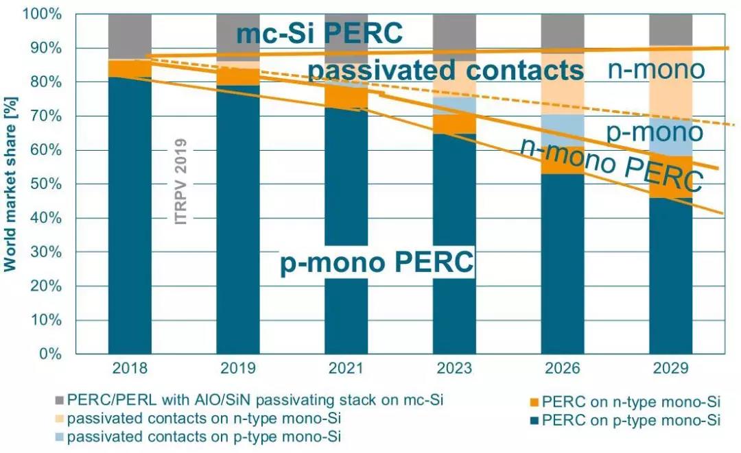 ▲图9 ITRPV 2019预测不同类型太阳能电池的市场份额