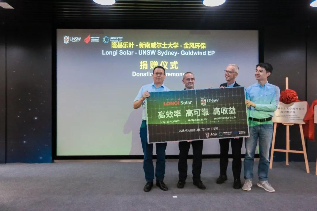 在本次活动中,隆基向新南威尔士大学与金风环保集团合作研究项目——“用光伏驱动的水处理系统”共捐赠15块高效单晶半片组件。隆基乐叶产品总监王梦松与新南威尔士大学(宜兴)环境技术转移中心执行董事兼 CEO,T.DavidWaite 教授共同出席了本次捐赠仪式。T.David Waite教授对隆基为水处理系统做出的贡献表达了诚挚感谢。