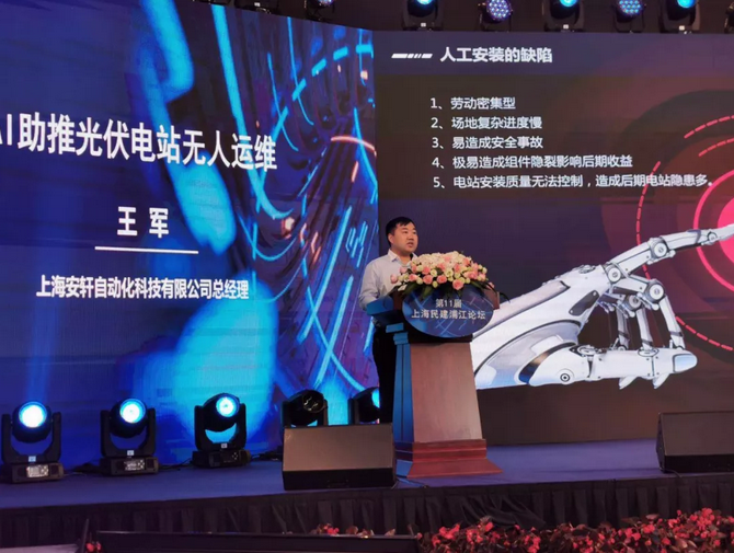 上海安轩自动化科技有限公司总经理王军作为科技创新企业代表出席论坛并作了“AI助推光伏电站无人运维”的主题演讲。演讲中,王军就推进基于人工智能、物联网和大数据技术的“智能组件安装系统”和“光伏电站智能清洗运维机器人”等智能化产品在光伏产业中的应用作了阐述,以推进智能化产品应用推进光伏产业高质量发展,推动智慧能源进步。
