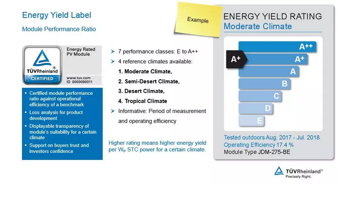 “发电量评级标签”不仅能为不同组件在特定气候条件下的户外发电性能提供对比依据,更能为投资方及买家为特定气候选择合适的光伏组件提供指导。