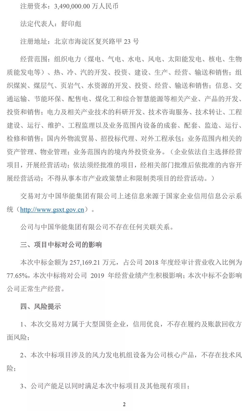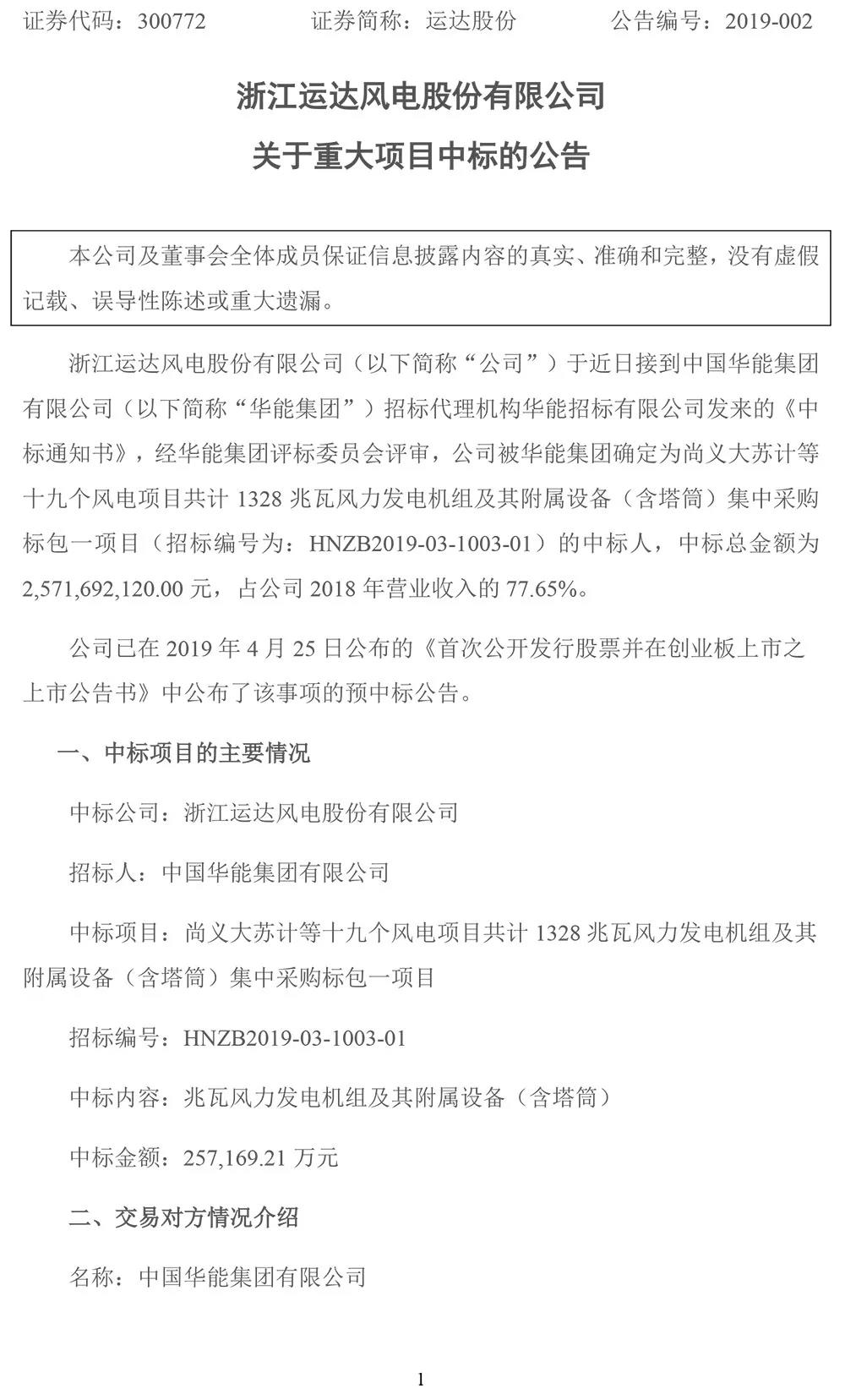 运达股份4月30日发布公告,公司被华能集团确定为尚义大苏计等十九个风电项目共计1328兆瓦风力发电机组及其附属设备(含塔筒)集中采购标包一项目的中标人,中标总金额为2,571,692,120.00元,占公司2018年营业收入的77.65%。