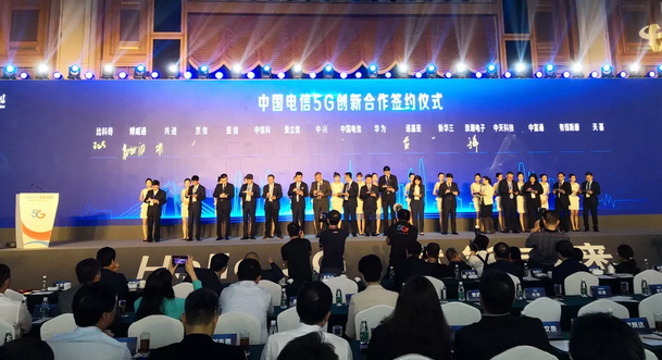 图为中国电信与技术创新类合作伙伴现场签约,右四为薛驰总裁