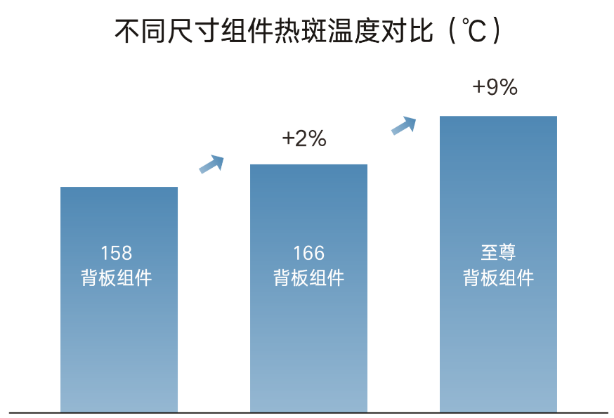 此外,根据IEC61215标准,至尊组件已通过热斑耐久性权威测试。图3比较了158、166、至尊三种不同系列背板组件的热斑最高温度。其中,至尊背板组件热斑最高温度仅比166组件高7%。因此,至尊组件在高功率输出的同时还保障了发生最恶劣阴影遮挡条件下,组件仍可以安全运行。