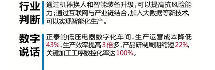 “这是一场没有硝烟的战争,正泰人不彷徨、不退缩,上下同欲者胜,风雨同舟者兴。”正泰集团董事长南存辉表示。作为浙江传统制造业转型升级的缩影,正泰屡次从“危”与“机”的辩证认识中抢抓机遇,通过拥抱新理念、新技术,诠释制造业转型升级的“命题”。