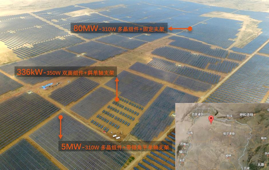 在内蒙古库布奇沙漠中,建有336kWp使用了单晶PERC双面组件的光伏实证电站,该项目建设于2017年5月,是国内最早的使用单晶PERC双面组件建设的光伏项目之一。该项目业主为亿利资源,由隆基乐叶供应960块350Wp单晶双面PERC组件,搭配斜单轴跟踪支架,以验证单晶双面PERC加跟踪系统的发电量增益情况。在双面实证项目旁建设有大规模的搭配固定支架及带倾角的平单轴跟踪支架的常规多晶组件电站作为发电对比参照。