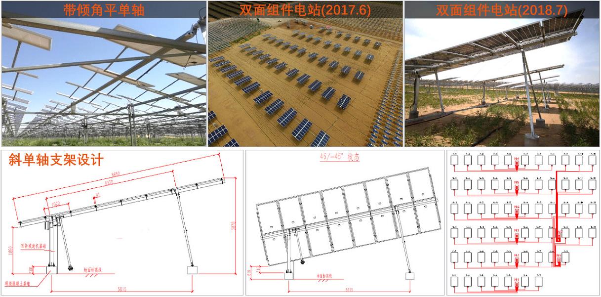 沙漠地区是应用双面组件的绝佳场景,因黄沙地的反射率可达35~40%且地表平整,库布奇项目因承担绿化固沙任务,地表持续滴灌并逐渐长有植被,估计地表反射率降为约30%,仍有很好的反射效果。在北纬40o的高纬度地区,使用常规平单轴跟踪支架的发电增益效果不及低纬度地区,使用带倾角的平单轴支架或者斜单轴支架则会有较好的发电提升效果。双面组件所搭配的斜单轴支架对组件背面无直接遮挡,-45o~+45o跟踪,组件8*2置于支架上, 6~8串组件接入1台50kWp逆变器(共8台)。这种斜单轴支架占地面积较大,阵列排布稀疏有利于双面组件的背面发电增益,实际项目中在土地成本不高时可以考虑。