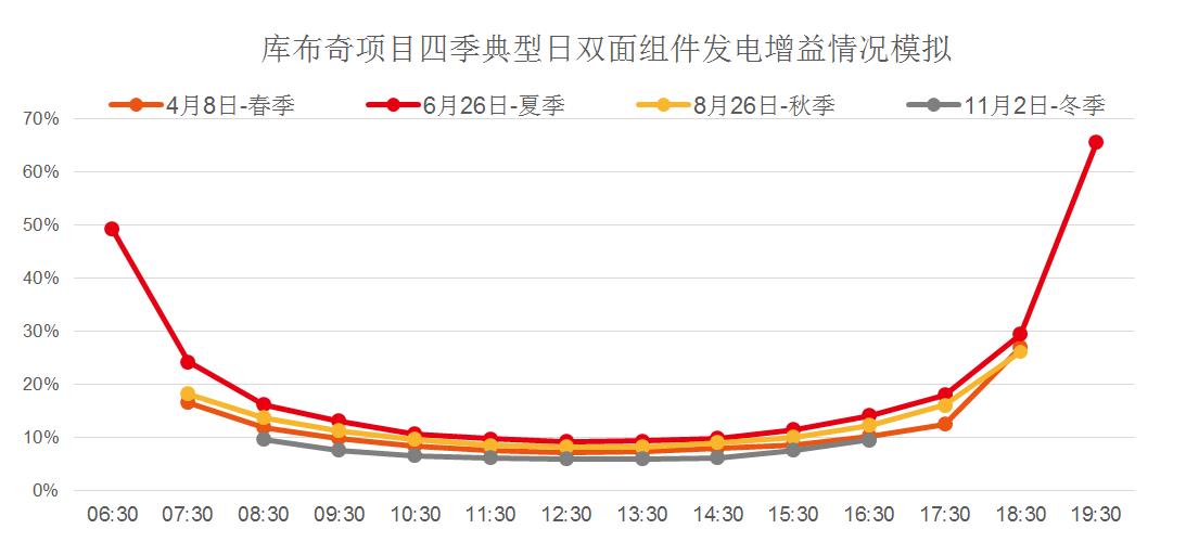 双面组件加跟踪支架全年的发电增益有明显的季节性,夏季最高的月份超过40%。由于库布奇地区纬度较高,跟踪支架夏季发电有较大增益,而冬季出现明显的负增益情况,因此双面加跟踪系统冬季与夏季发电量存在很大的差异。另外,扣除跟踪支架的影响仍可发现双面组件的发电增益也存在夏季高、冬季低的特点。