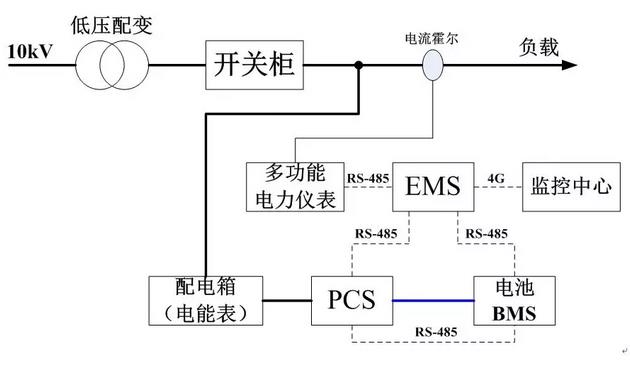 系统测控装置实时采集用电负载功率,作为储能系统充放电的控制依据,当负载功率超过设定的启动放电阈值时,储能系统开始放电和市电共同为负载供电,当负载功率低于设定的停止放电阈值时,储能系统停止放电;当负载功率低于设定的启动充电阈值时,储能系统开始充电运行,充电功率可调节,确保储能系统充电功率和负载功率不超过变压器的总功率,当负载功率高于设定的停止充电阈值时,储能系统停止充电。