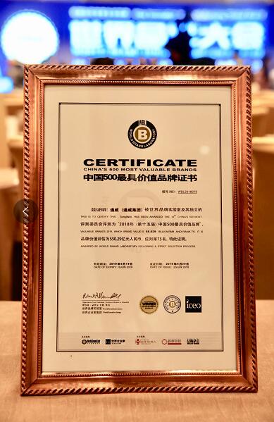 2018年6月20日,2018年第十五届世界品牌大会暨中国500最具价值品牌发布会隆重举行。2018年,通威集团以550.29亿元的品牌价值再次荣列榜单,连续15年入选公信力和认同度最高、权威性最强的中国品牌国家队行列。多年来,在刘主席的高度重视和亲自带领下,通威品牌建设创新探索、与时俱进、硕果累累,社会认知度、美誉度逐年增强。从2004年的19亿元,到2018年一举突破550亿元,通威品牌建设不断刷新历史新高,展示了全球绿色农业和绿色能源领军品牌的雄厚实力。